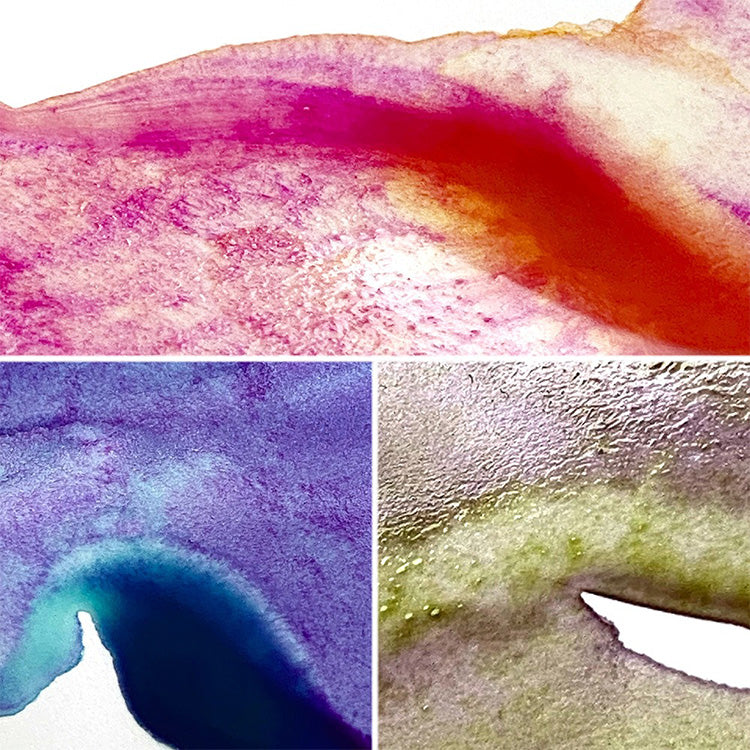 たっぷりの水で溶き、パレットの中で分離してから描くと、より色の変化を楽しむことができます。