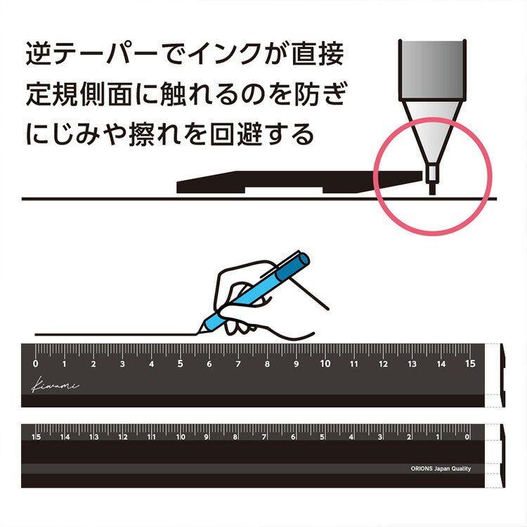 ●逆テーパーでインクが直接定規側面に触れるのを防ぎ、にじみや擦れを回避